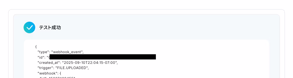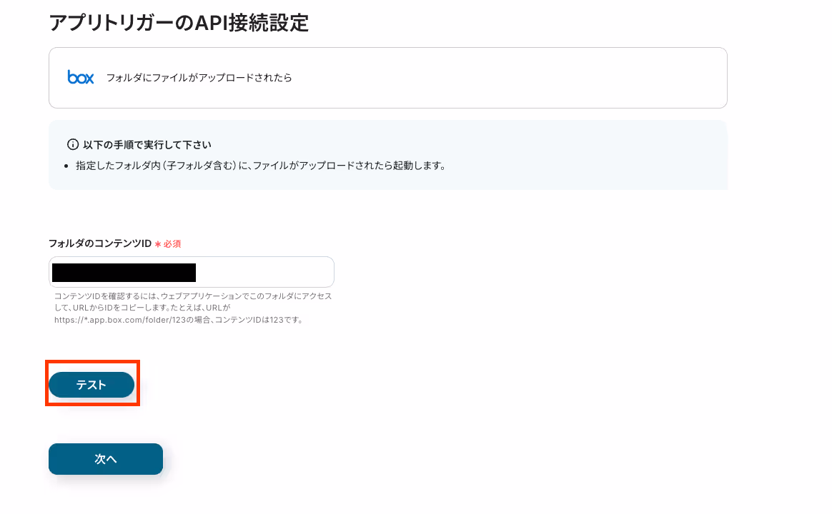 4. 次の画面で、アプリトリガーのAPI接続設定を行います。自分用のフォルダのコンテンツIDを入力してください。入力後、「テスト」をクリックしましょう。