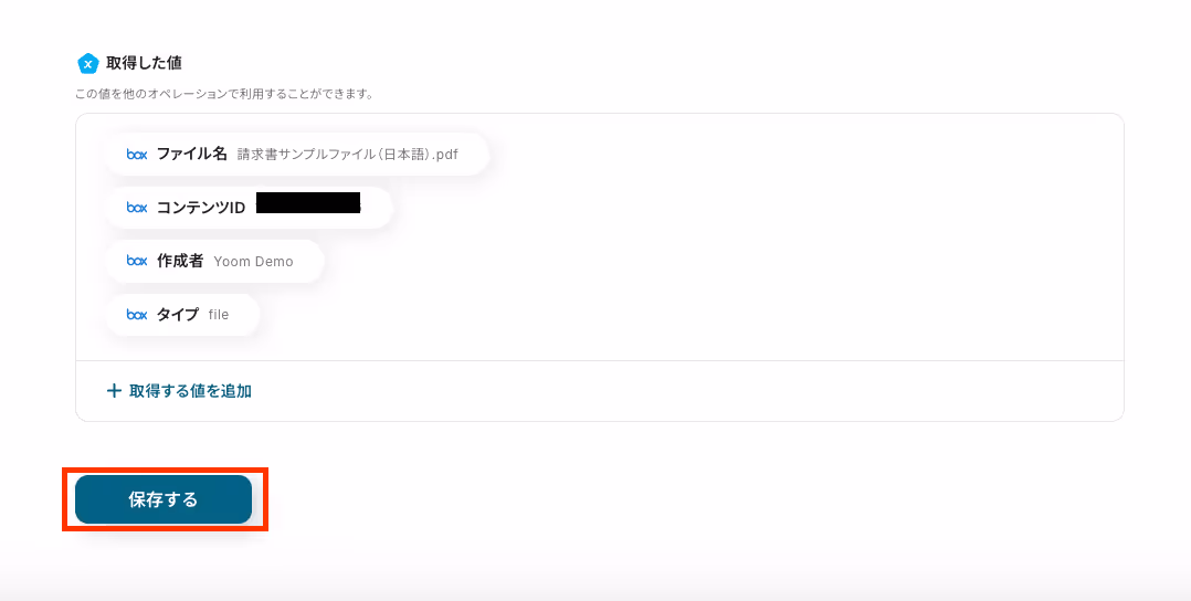 そのため、共有用フォルダへファイルをアップロードするアクションを設定する際、ここで取得した値をそのまま変数として引用できるようになります。