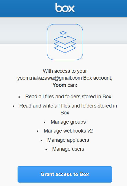 「Grant access to Box」をクリックするとマイアプリ登録が完了です。