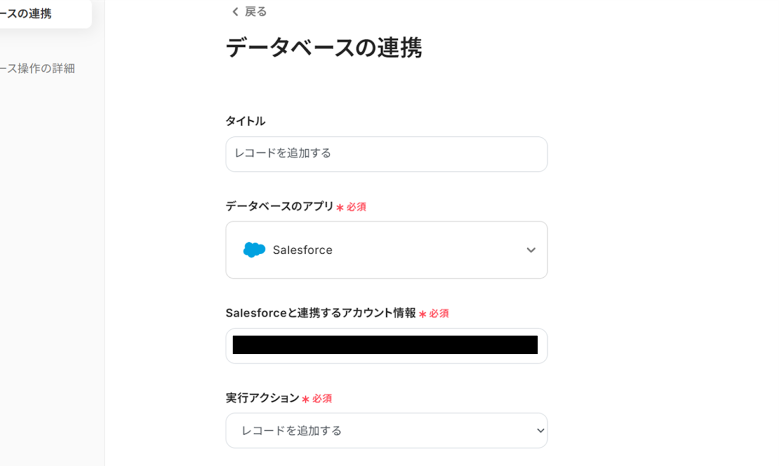 (2)「データベースの連携」画面から、先ほどと同様にタイトルやSalesforceと連携するアカウント情報に誤りがないかを確認します。