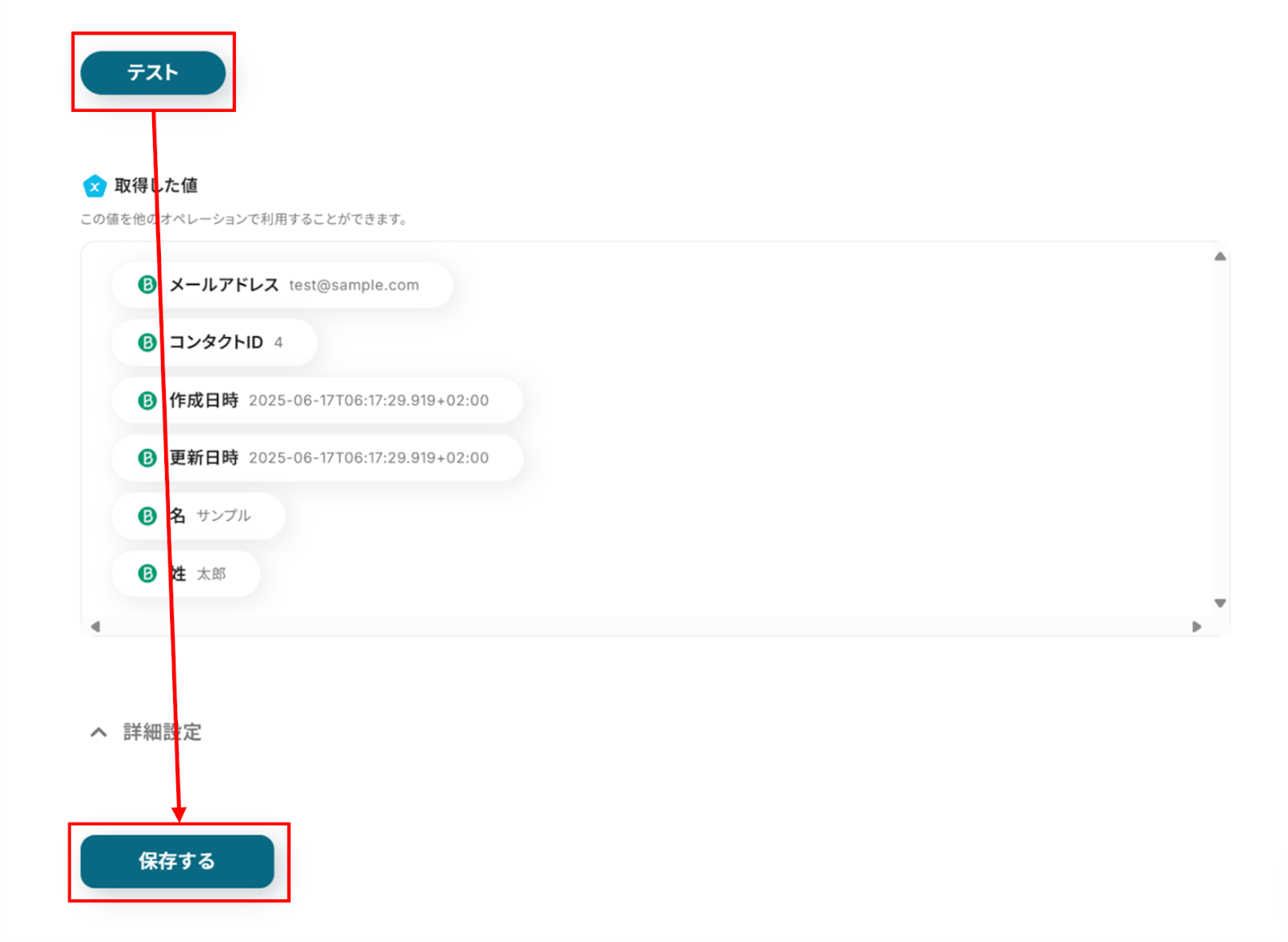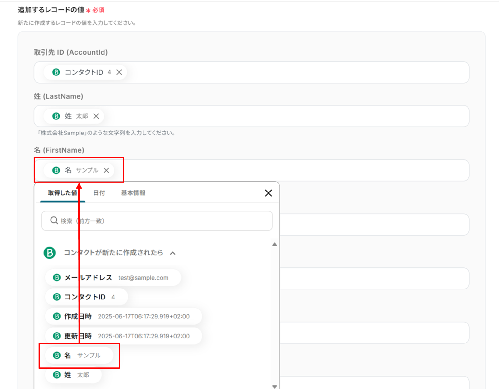 ただしカスタムフィールドによっては、オペレーション設定時に行うテストの後に、取得した値に自分で追加する必要があるため注意してください。