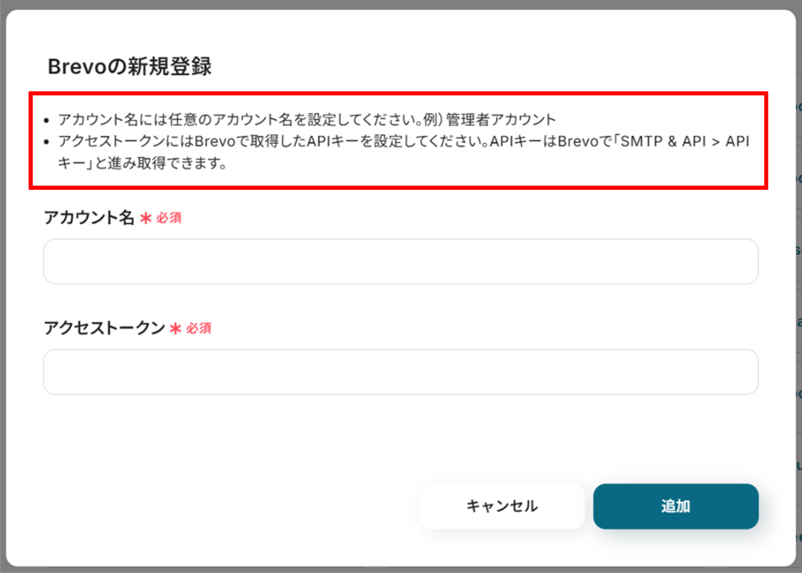 「Brevoの新規登録」画面から、赤枠を確認の上、アカウント名、アクセストークンを入力し、「追加」をクリックします。