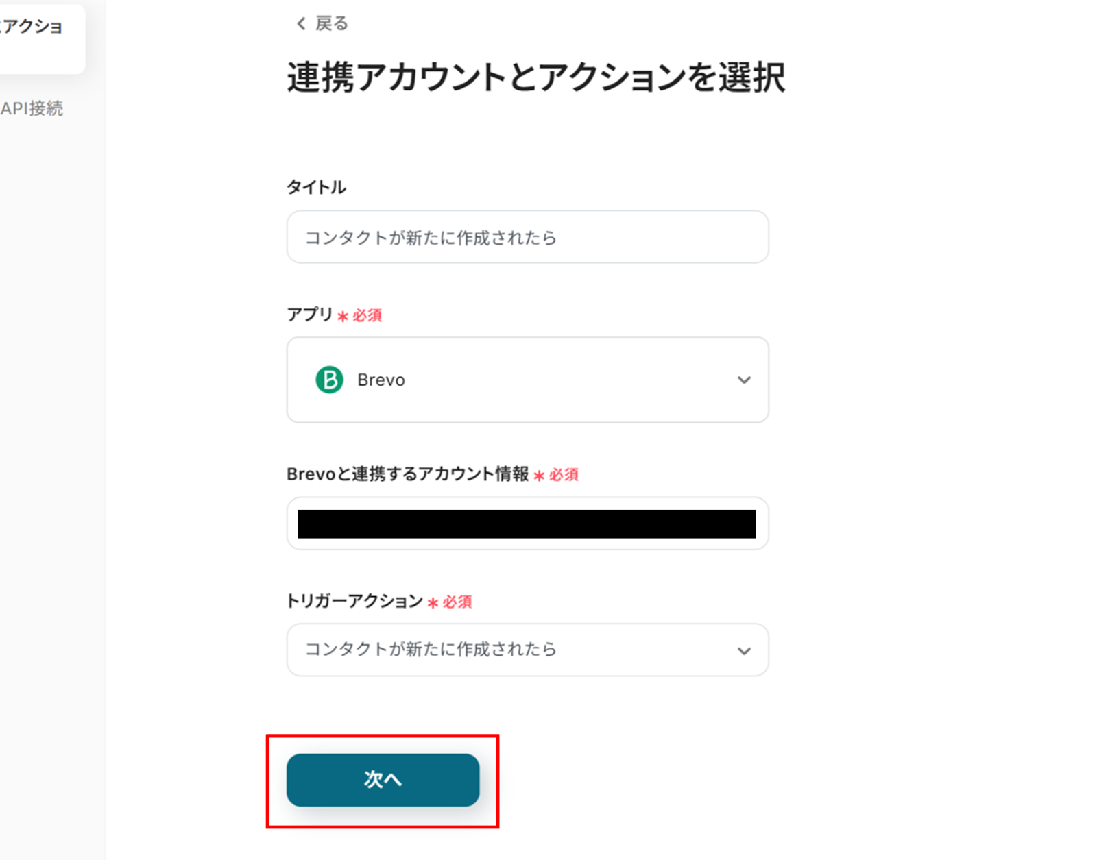 (2)Brevoの「連携アカウントとアクションを選択」画面から、Brevoと連携するアカウント情報に誤りがないかを確認します。タイトルは変更も可能です。
