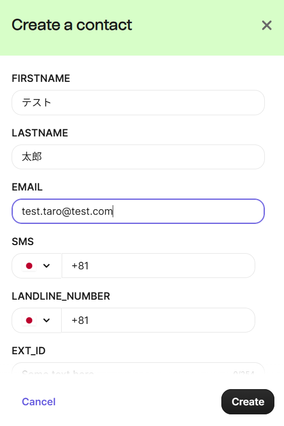 ここで一度アプリトリガーを動かすために、Brevoでテスト用のコンタクトを新たに作成してください。今回は以下のようなコンタクトをBrevoに作成してみました。