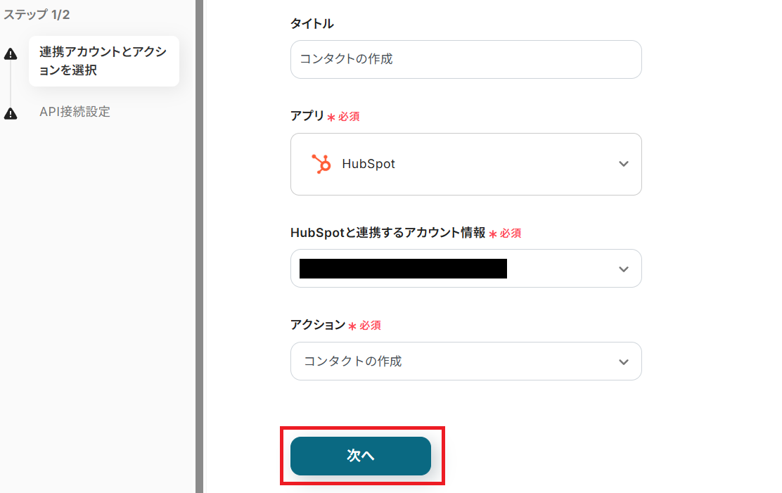 タイトルを任意で設定し、HubSpotと連携するアカウントやアクション内容を確認したら「次へ」を押してください。