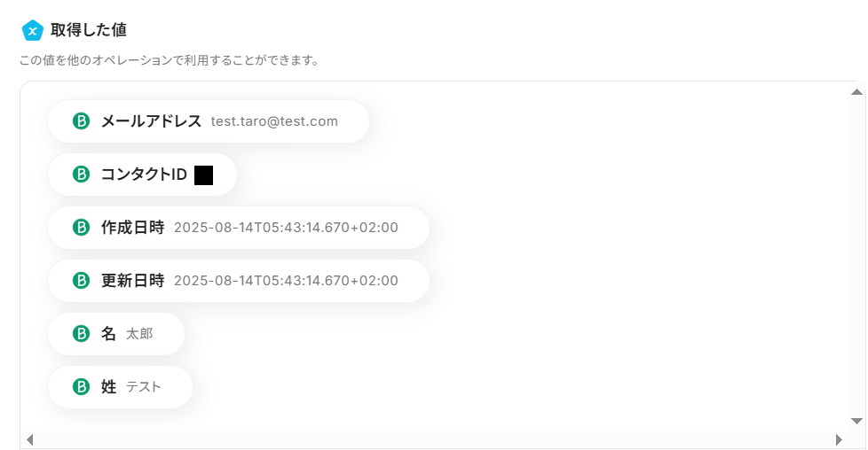 以下のように「取得した値」として、Brevoに作成したコンタクトの内容が反映されていればOKです。