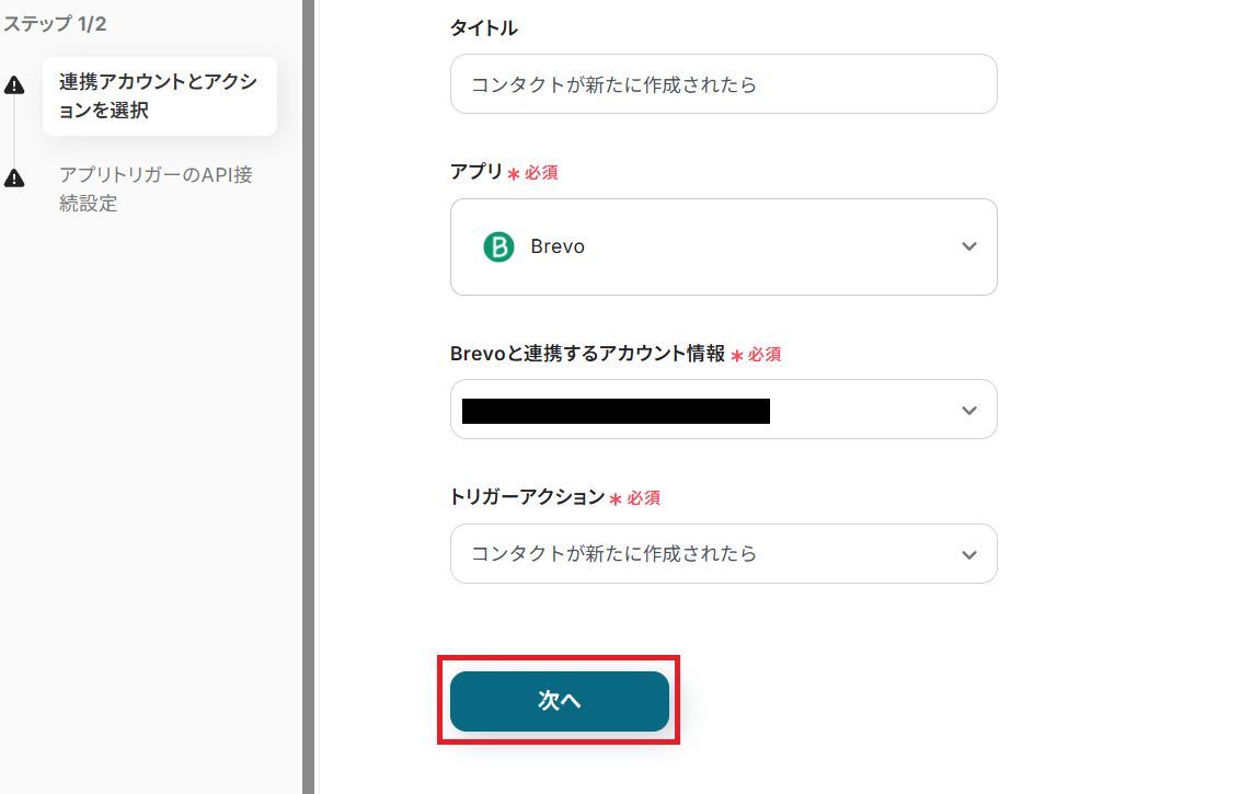 まずはタイトルを任意で設定し、Brevoと連携するアカウントやアクション内容を確認したら「次へ」を押してください。