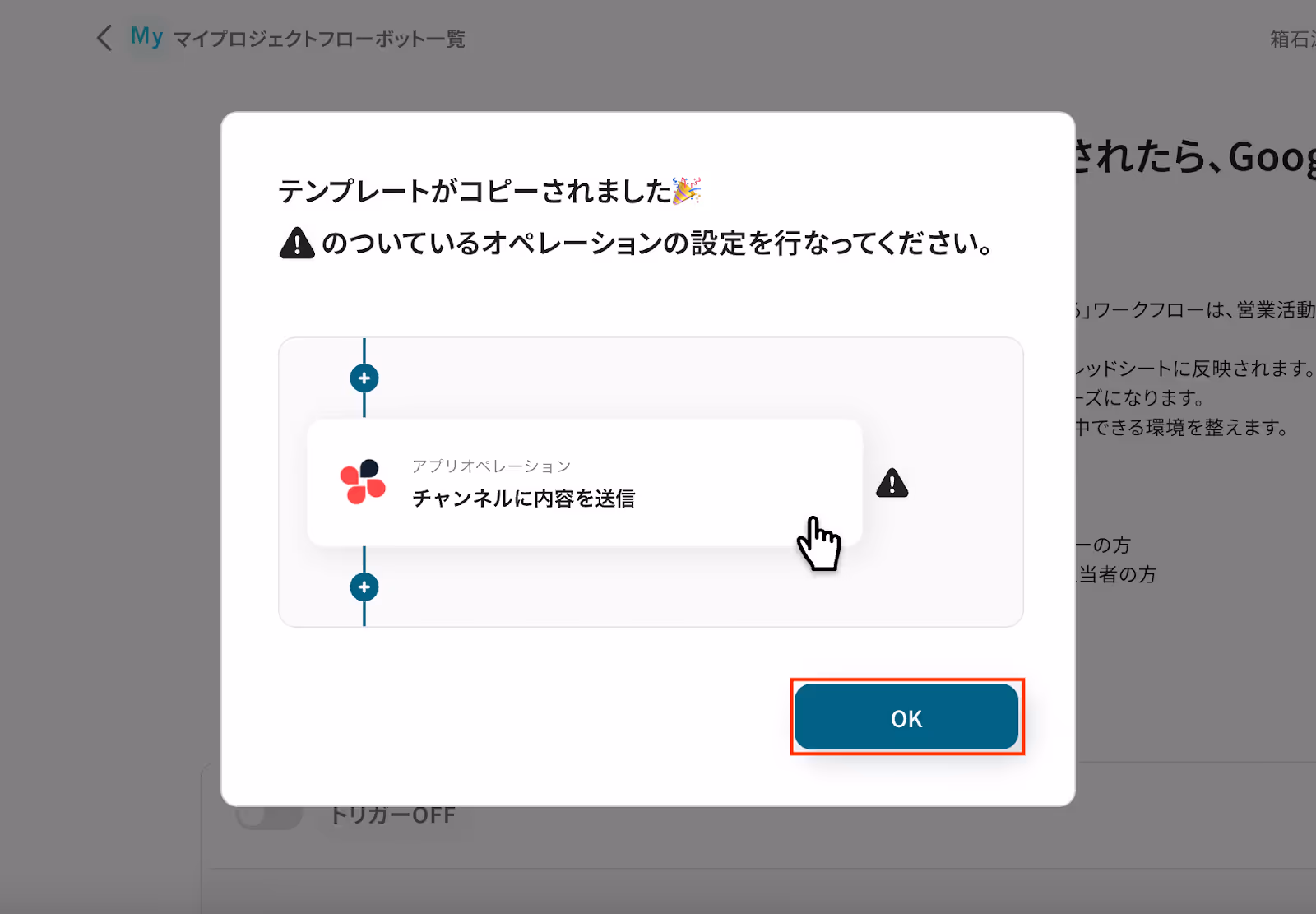 テンプレートがコピーされると、以下のような画面が表示されますので、「OK」をクリックして設定を進めましょう。