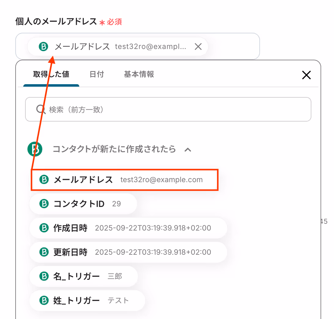 入力欄をクリックすると、トリガーのステップでBrevoから取得した値が表示されるので、選択して入力しましょう。取得した値を活用することで値が固定化されず、フローボットを起動するたびに最新の情報を自動で反映できます。
