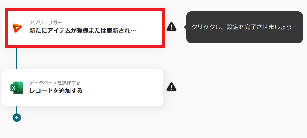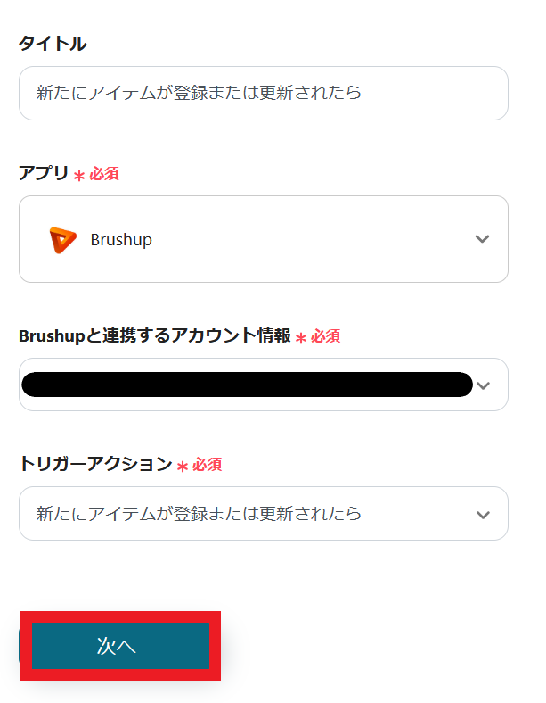トリガーアクションは、「新たにアイテムが登録または更新されたら」を選択します。