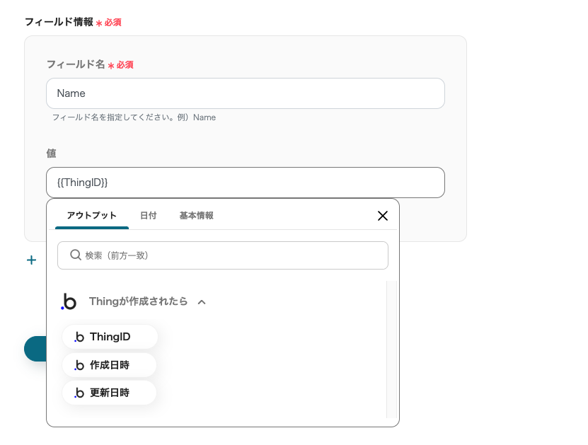 「値」は、欄をクリックすると表示される候補から該当項目を選択してください。今回はBubbleの「ThingID」を選択しました。