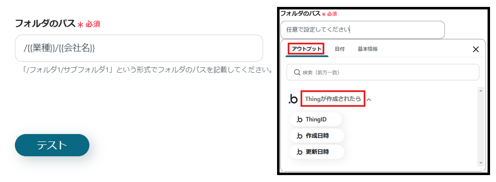※フォルダのパスは直接入力するか、アウトプットから選択します。下記画像の場合、「/(スラッシュ)」は直接入力し、「{{業種}}」と「{{会社名}}」は、枠をクリックして表示されるアウトプットの「Thingが作成されたら」の中から選択しています。アウトプットの値を利用することで、Thingごとに変わる内容をフォルダのパスに動的に反映します。
