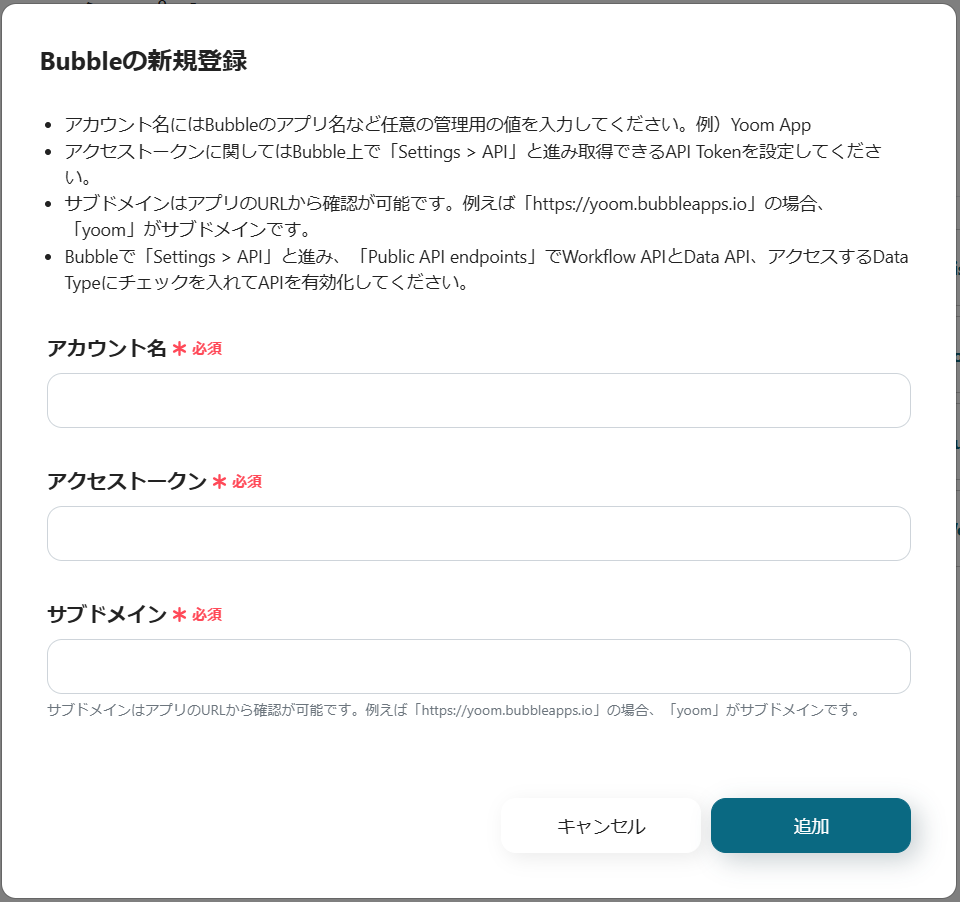 はじめに、BubbleとDropboxをYoomに連携させるため、マイアプリに登録します。