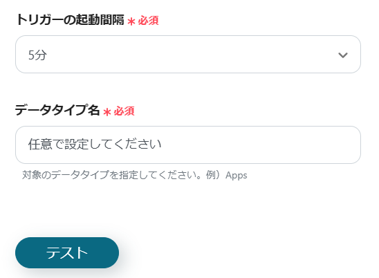 4.「トリガーの起動間隔」と「データタイプ名」を設定し、テストします。