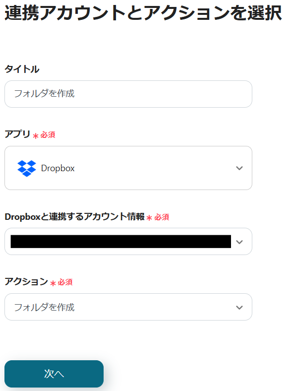 2.Dropboxと連携するアカウント情報を確認し、「次へ」をクリックします。