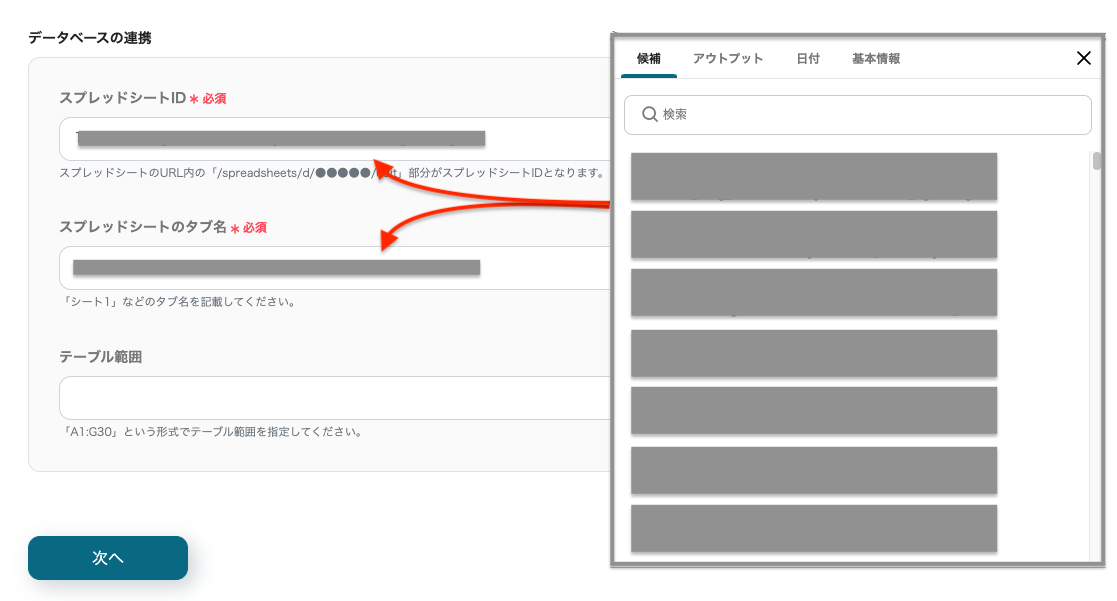 スプレッドシートIDは、欄をクリックして候補から選択するか、注釈を参考にして該当シートのURLから引用してください。