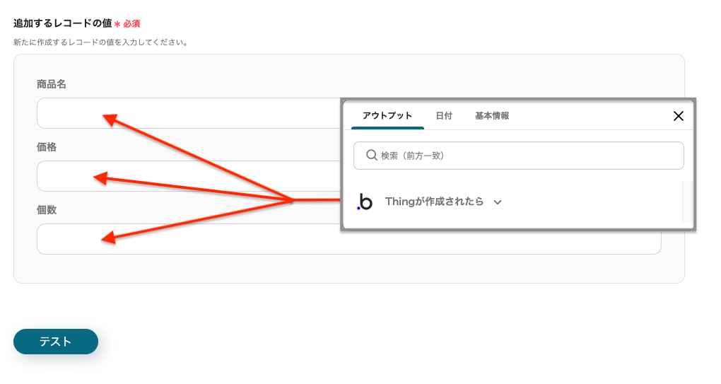 全て設定したら、「テスト」をクリックしてシートに情報が登録されているか確認しましょう。