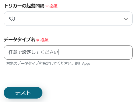 4.トリガーの起動間隔、データタイプ名を設定して、「テスト」をクリックします。