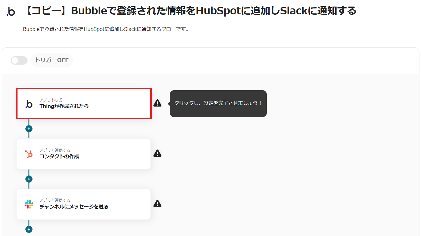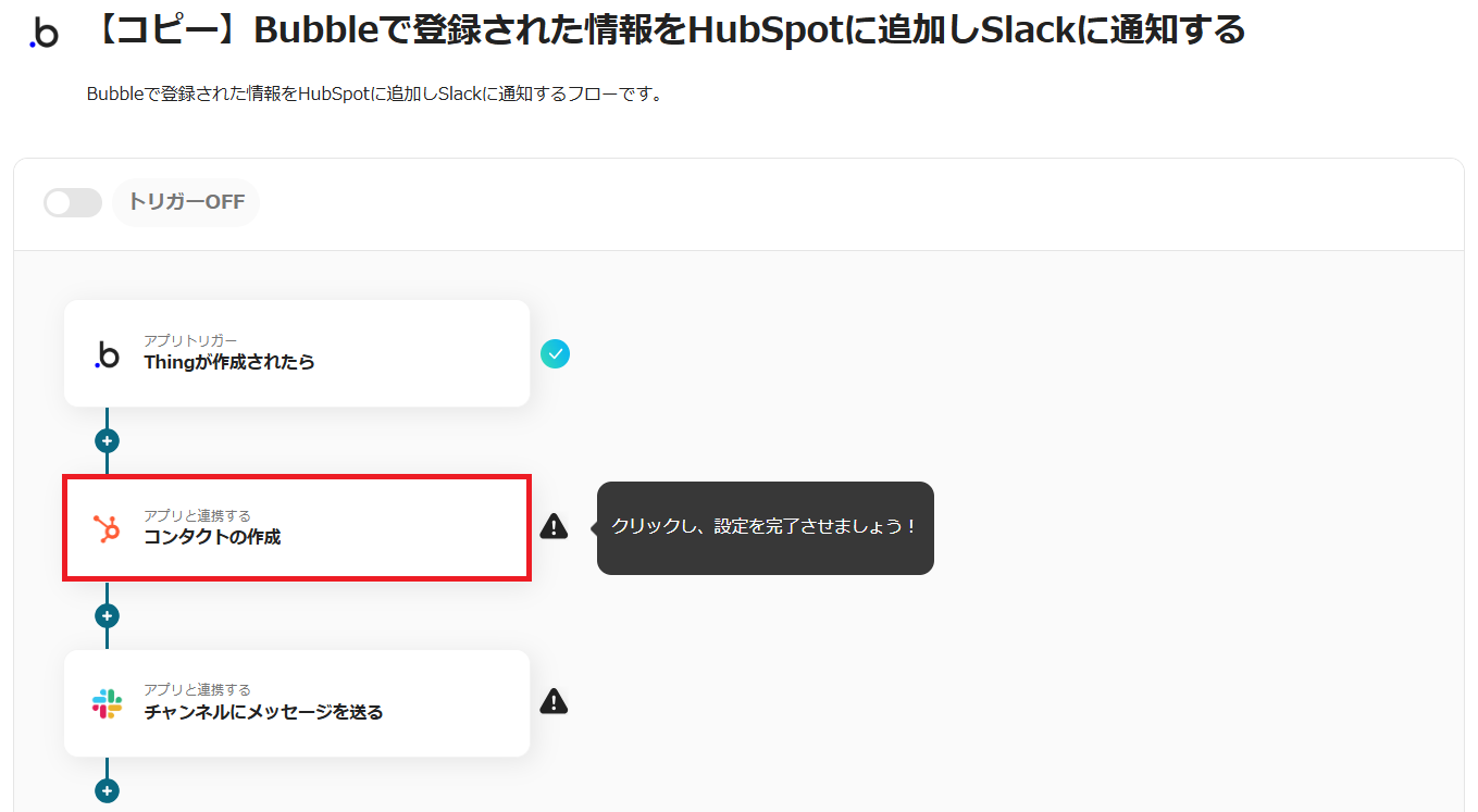 5.トリガーをONにすると、BubbleのThingにリードが登録されるたび、HubSpotにコンタクトが自動で追加され、Slackに通知されます。