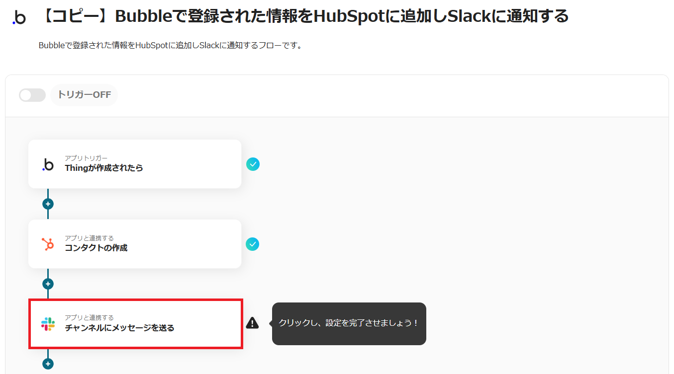 最後に、BubbleとHubSpotにリードの登録が完了したことをSlackに通知する設定を行います。