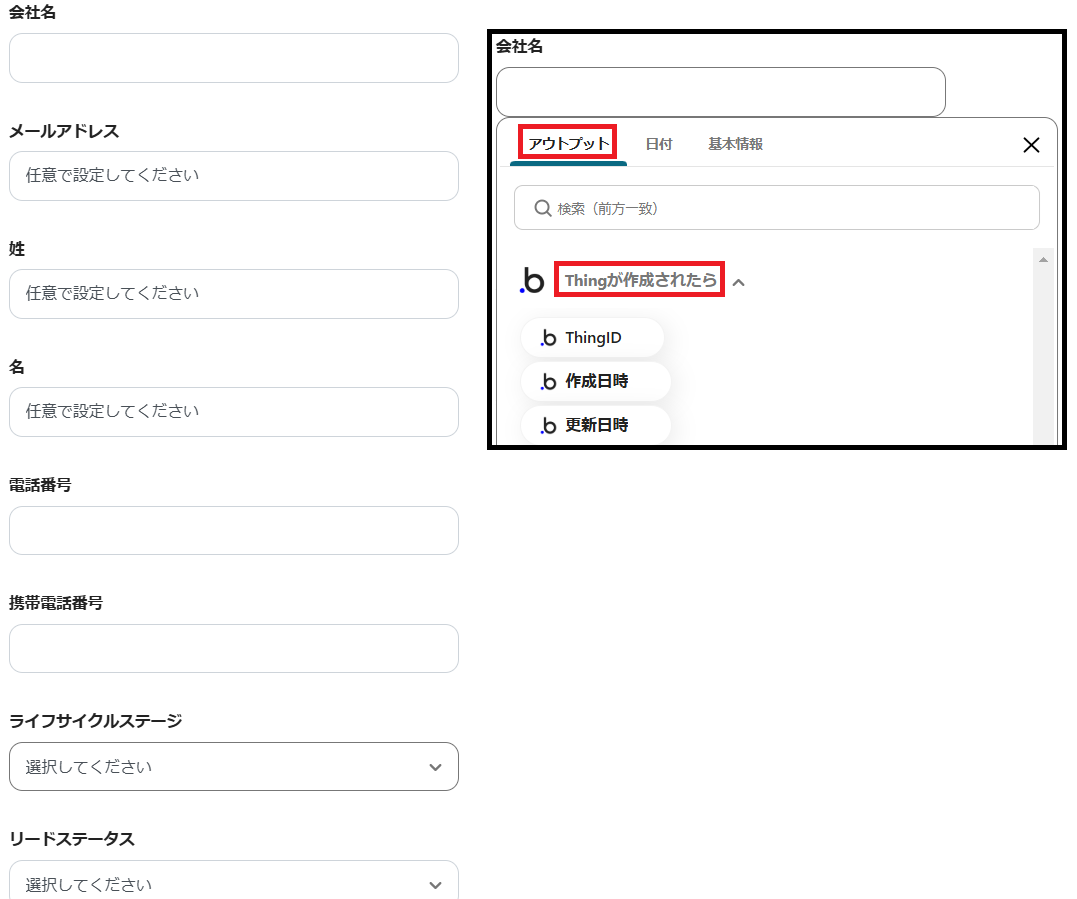 ※会社名などの入力項目は、定型文を直接入力できます。また、枠をクリックして表示されるアウトプットの「Thingが作成されたら」からも選択します。(値は二重括弧で表示されます)これにより、リードごとに変わる内容を動的に反映できます。
