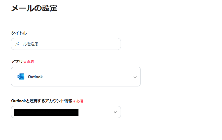 メールの設定の画面が表示されるので、Outlookのアカウントが間違いないかを確認します。