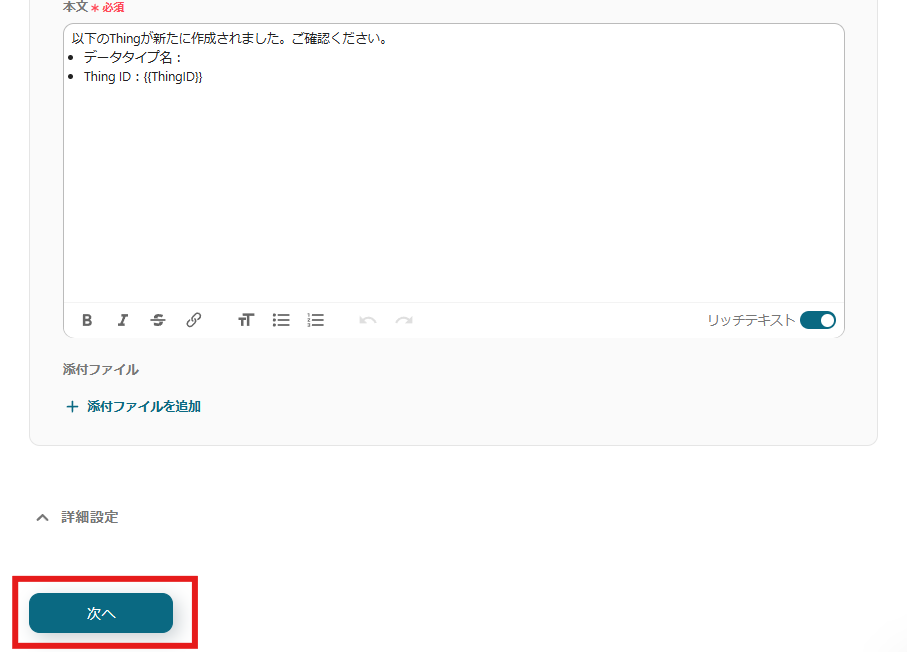 内容設定が完了したら「次へ」をクリックします。