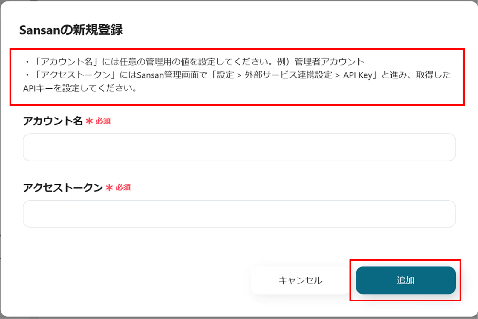 「Sansanの新規登録」画面から赤枠を確認の上、アカウント名、アクセストークンを入力します。入力が完了したら「追加」をクリックします。