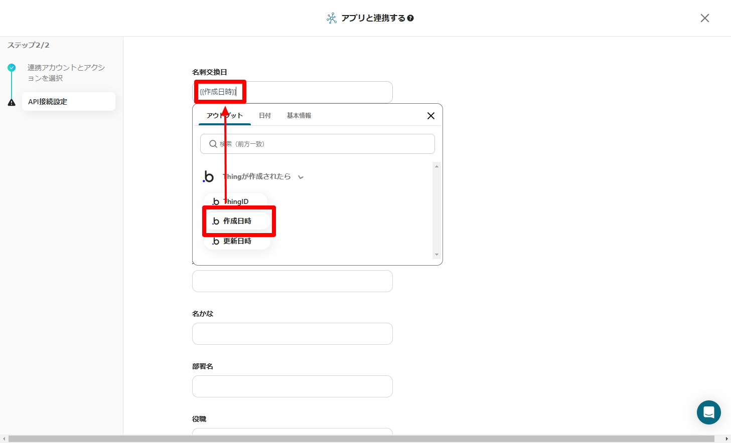 ※ここでは、「名刺交換日」の項目に対してシステムから返されるデータとして「作成日時」を選択します。