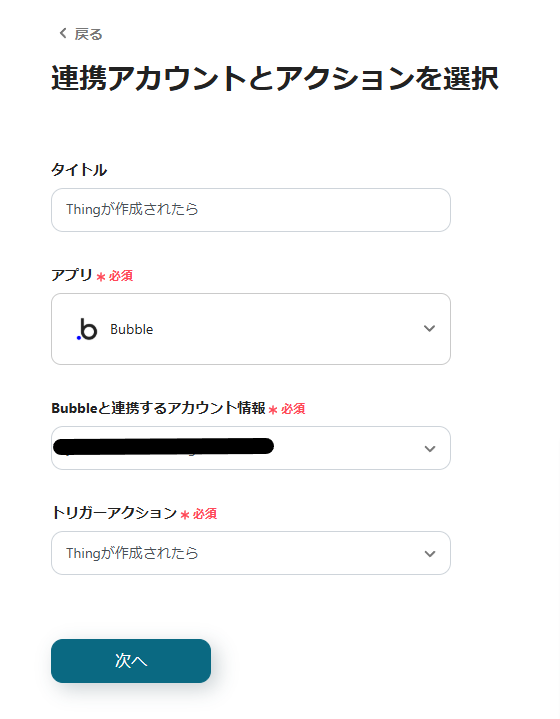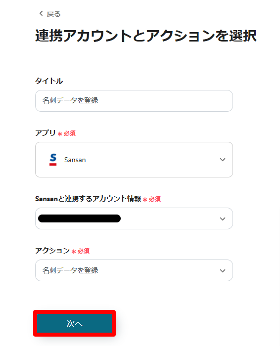 連携するアカウント情報に誤りがないかを確認し、必要項目を入力したら「次へ」をクリックします。