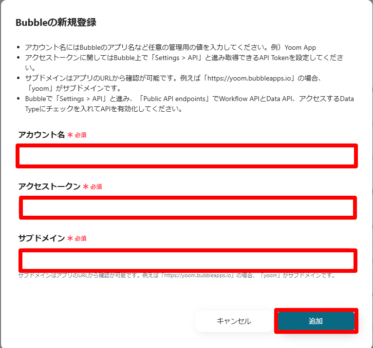 BubbleとSansanをYoomに接続するマイアプリ登録を行います。マイアプリ登録を先にしておくと、自動化設定がスムーズに進みます。