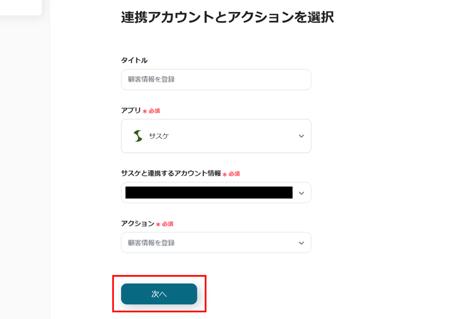 (2)サスケの「連携アカウントとアクションを選択」画面から、サスケと連携するアカウント情報に誤りがないかを確認し、アクションは「顧客情報を登録」のままで「次へ」をクリックします。
