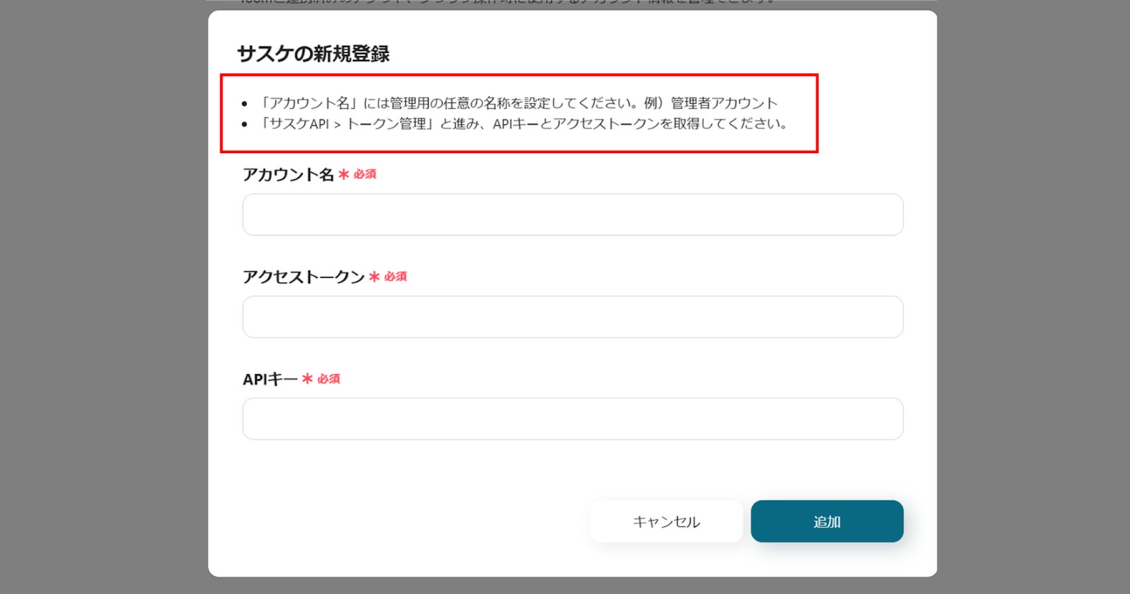 (5)「サスケの新規登録」画面から、赤枠を確認の上、アカウント名、アクセストークン、APIキーを入力し、「追加」をクリックします。