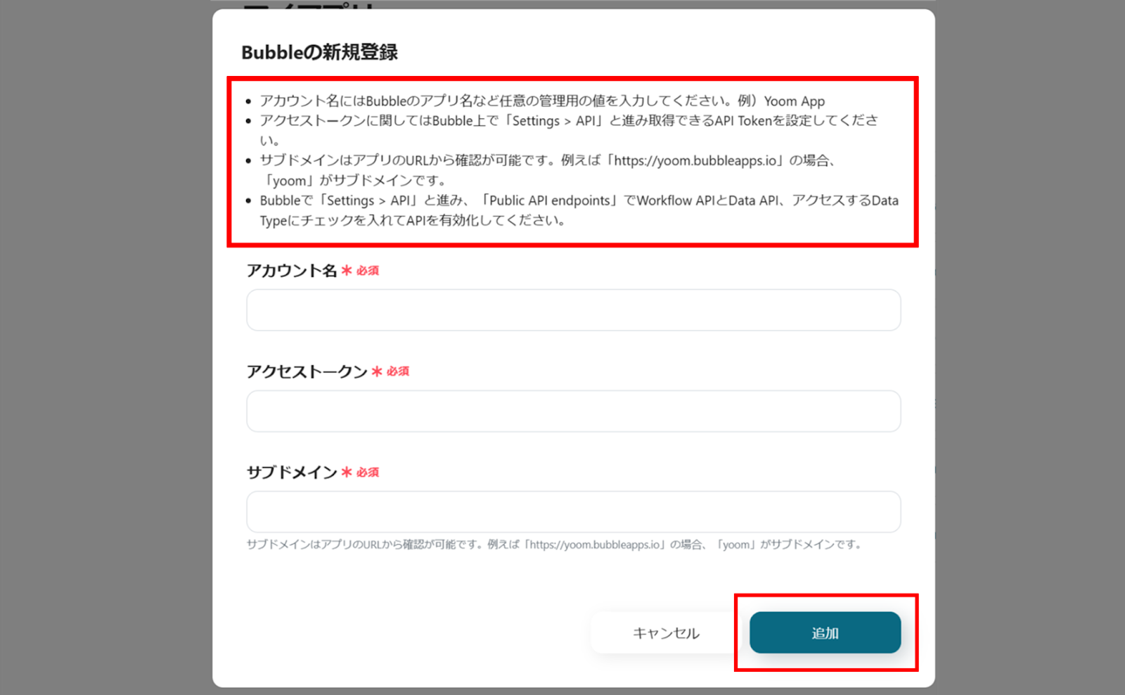 (3)「Bubbleの新規登録」画面から、赤枠を確認の上、アカウント名、アクセストークン、サブドメインを入力します。