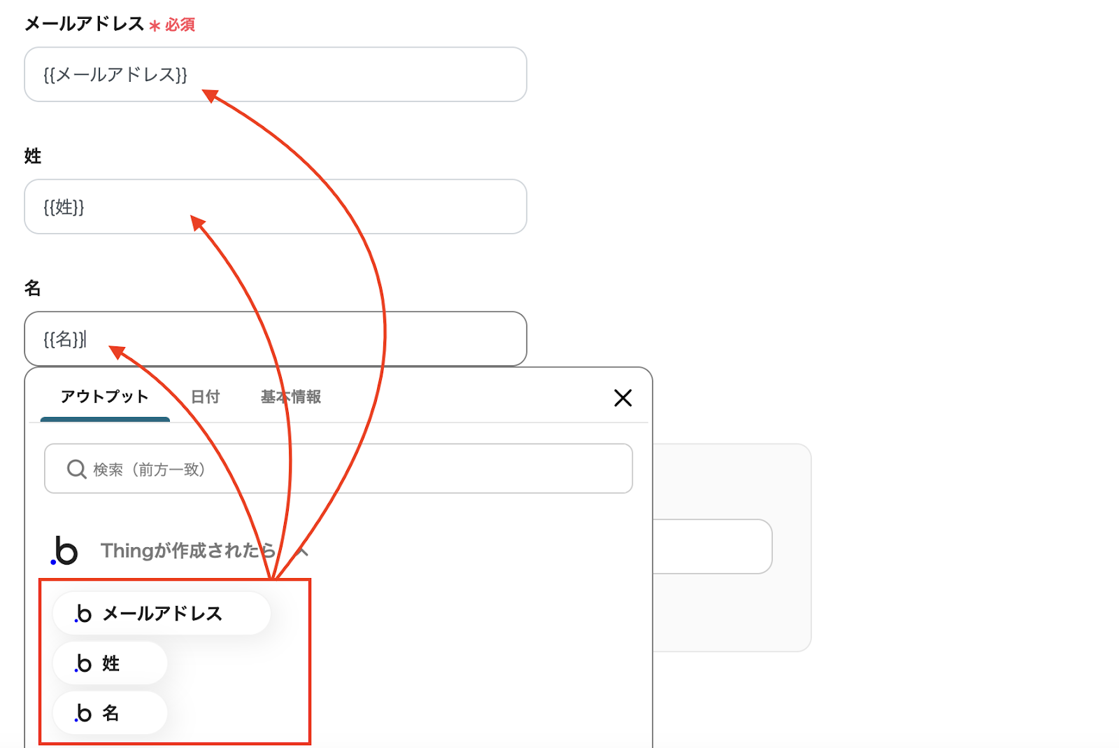 (以下は例として、前ステップで取得した「メールアドレス」、「姓」、「名」の情報を引用したものです。)