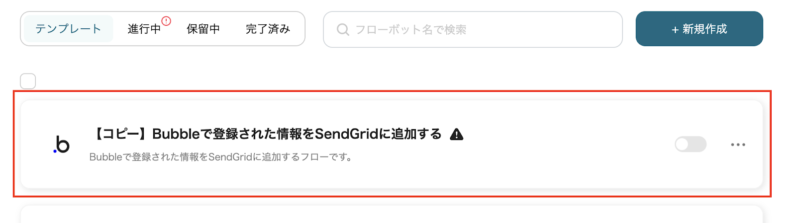 では、「Bubbleで登録された情報をSendGridに追加する」のテンプレートを使ったフローボットを作成していきましょう。