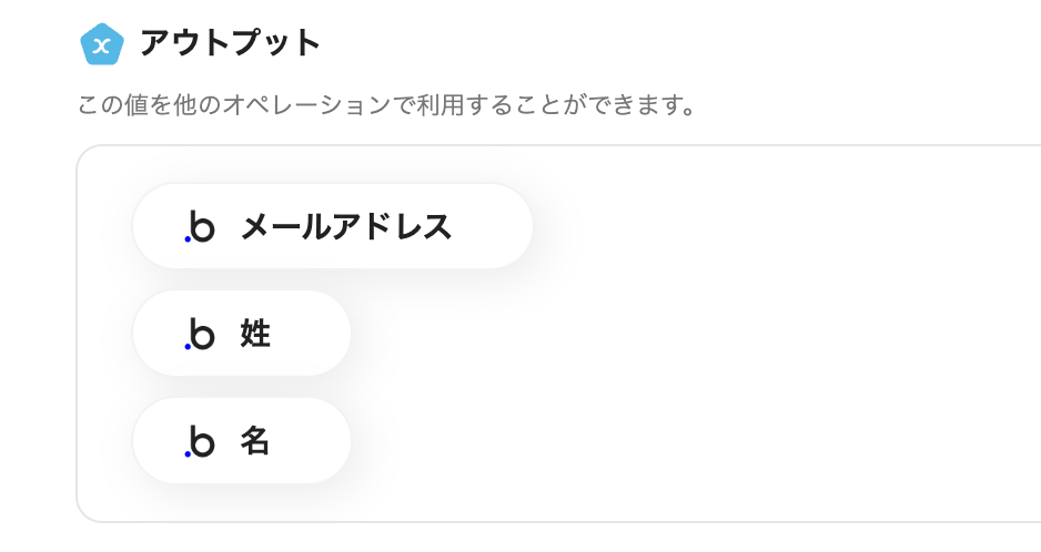 アウトプット情報は、「この値を他のオペレーションで利用することができます。」という注釈の通り、この後のステップで引用・活用できます。