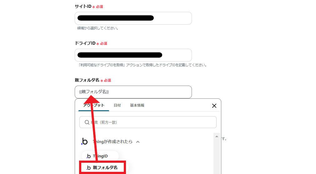 サイトID、ドライブID、親フォルダのアイテムIDは候補から選択してください。