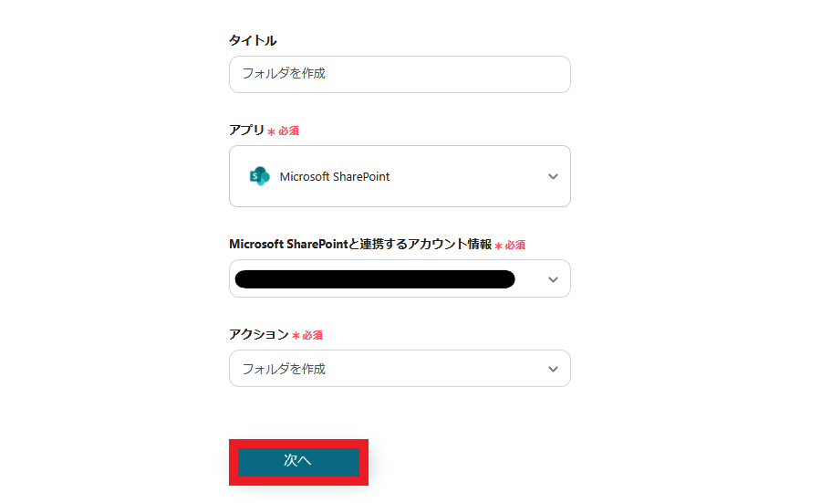 2.Microsoft SharePointと連携するアカウント情報を入力します。