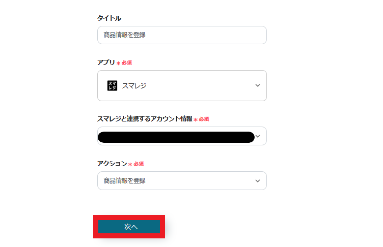 アクションは、「商品情報を登録」を選択します。