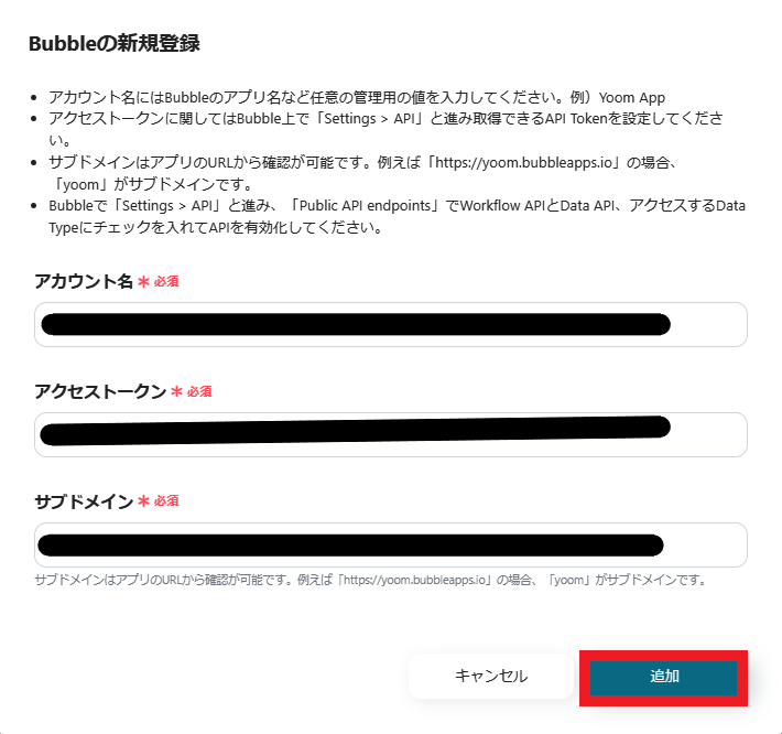 Bubbleと連携するアカウント情報を入力します。