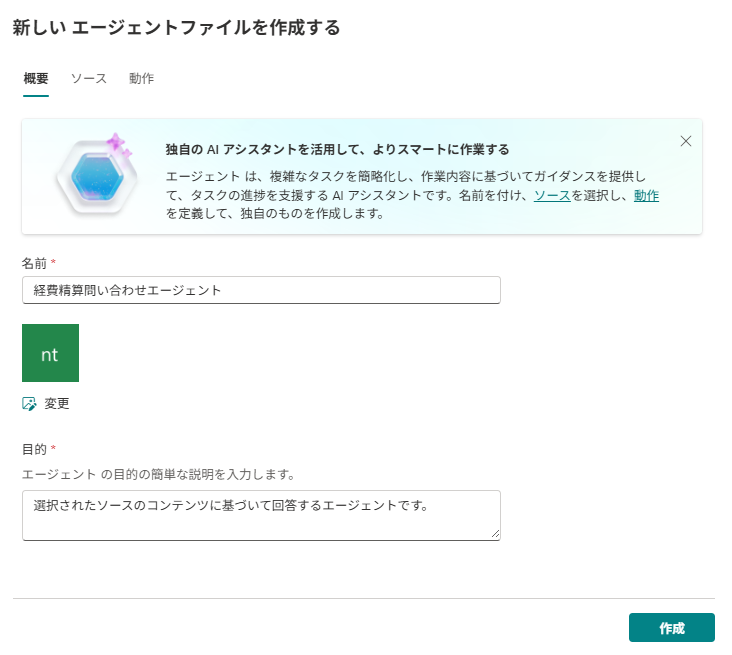動作のページでは、エージェントに指示を与えます。今回は、以下のように簡潔な指示を与え、作成しました。