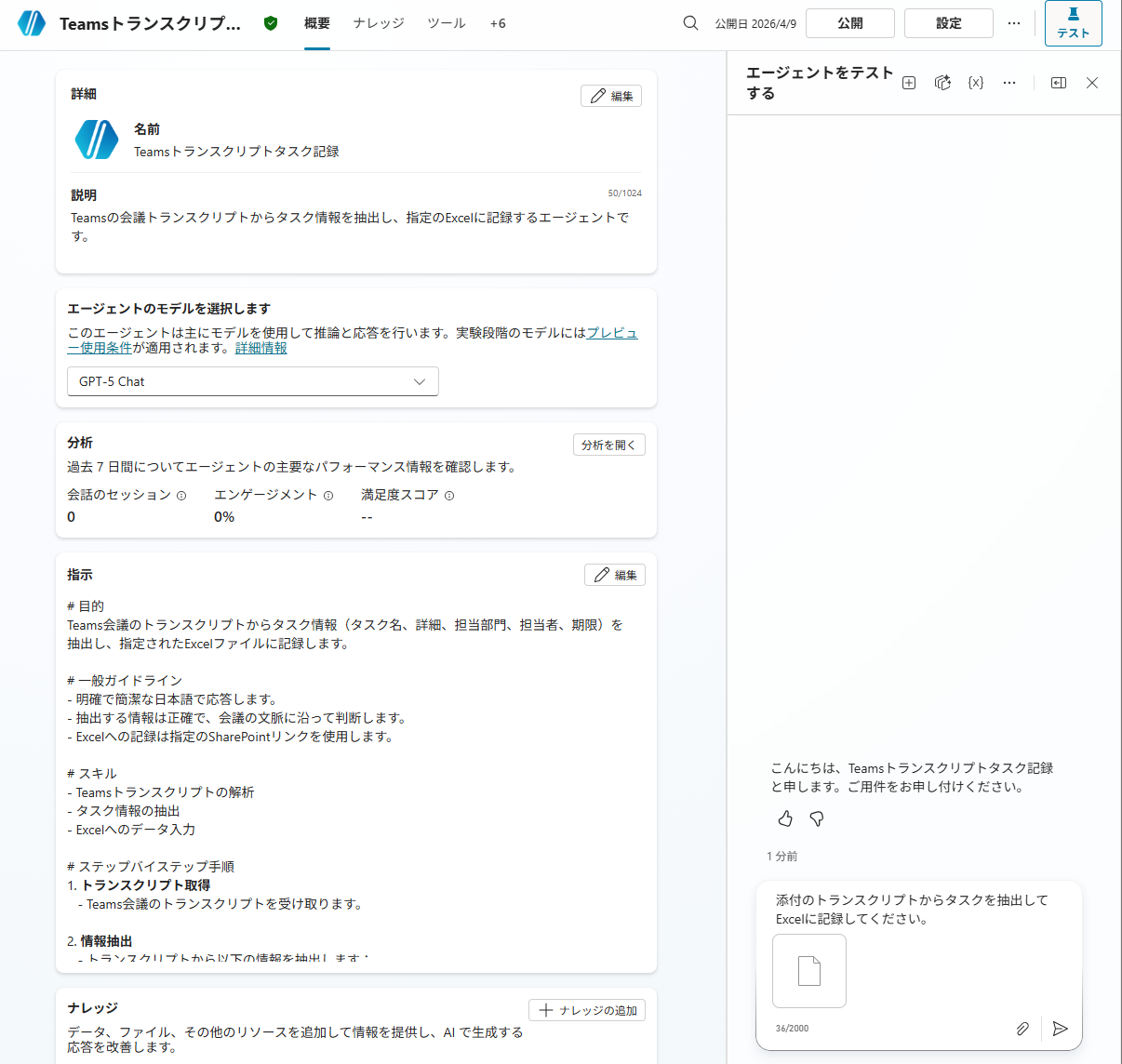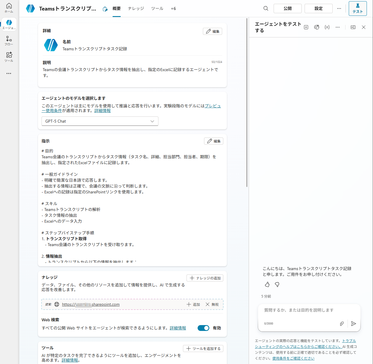 以下が作成されたエージェントです。指示やナレッジが自動で設定されています。