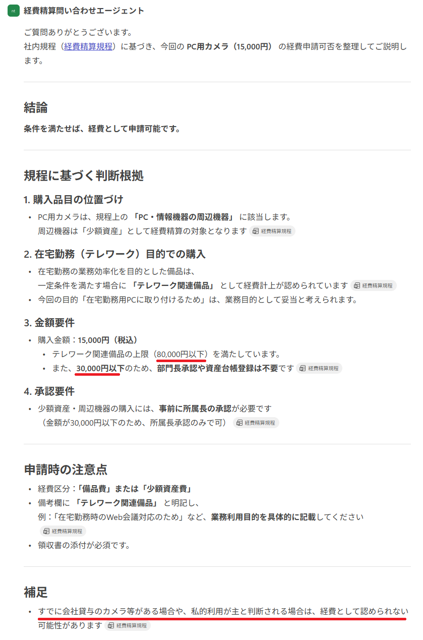 ノーコードで初心者でも簡単に構築できる 指定したファイルを参照し高精度な回答を生成できる 参照元のファイルが回答に明示される 今回作成したSharePoint連携のエージェントでは、ノーコードによる直感的な操作で、初めてでも迷わずスムーズに構築できることが確認できました。実際の回答精度も高く、対象ファイルの内容を正確に読み取り、購入可能な金額基準を判断するだけでなく、申請が却下される条件まで自律的に提示してくれました。 これはCopilotの優れた文脈理解能力を示しています。さらに、回答には参照したファイルが情報源として明記されるため、事実確認を容易に行える点も実務において大変便利です。