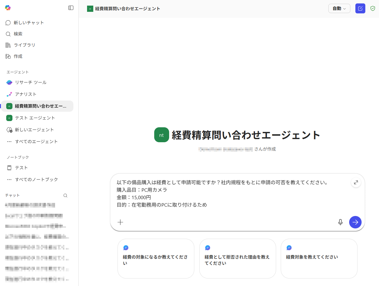 検証1:SharePointのファイルを情報源として回答するエージェントを作成 まずは、SharePointに保存されている経費関連のファイルをソースとして、問い合わせに自動回答するエージェントを作成してみます。