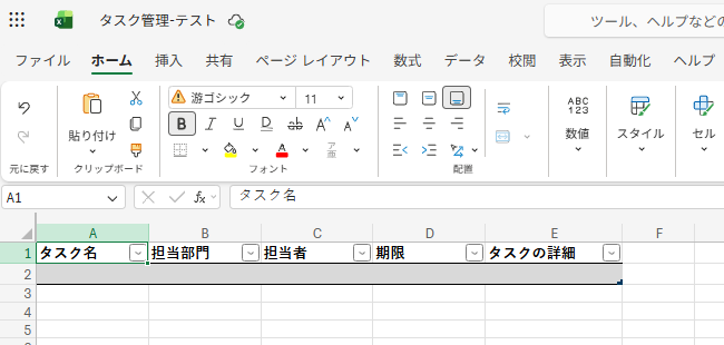 作成手順 まずは、タスクを記録するExcelを作成しておきます。表は、テーブル形式になっている必要があります。