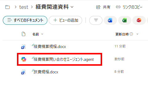 作成したエージェントは、SharePointのフォルダ内に保存されます。