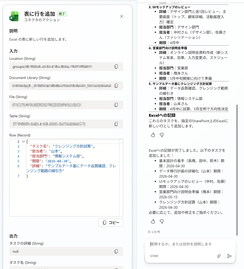 AIによる大枠の自動生成とノーコード設計により非エンジニアでも導入しやすい 情報が不足している項目は臨機応変に空欄とするなど、AIの高度な分析・判断能力を確認できた 外部ツール連携の設定には、事前のデータ加工や細かな設定が必要になる場合がある Copilot Studioを活用した検証では、AIがエージェントの基本構成を自動生成してくれるため、最小限の設定とノーコード操作でスピーディに構築できました。実際のタスク抽出処理においても、会議のトランスクリプトを読み込み、Excelへ記録するまでの一連のプロセスがわずか10秒程度で完了し、業務効率化の可能性を実感しています。また、会議内で言及されなかったタスクの詳細については、AIが自ら文脈を分析してあえて空欄のまま処理するなど、臨機応変かつ柔軟な対応力を持つこともわかりました。