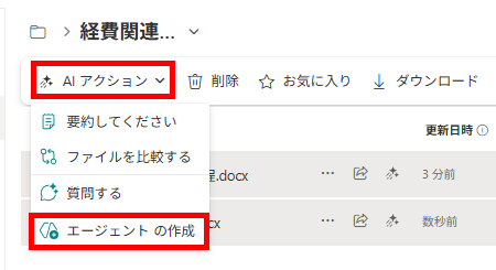 ソースとするファイルを選択し、「AIアクション」の「エージェントの作成」をクリックします。