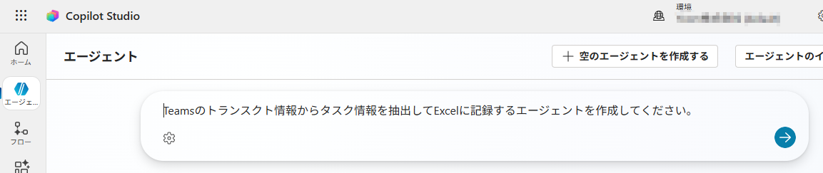 検証2:Copilot Studioでタスク管理エージェントを作成 続いてCopilot Studioを利用し、Teamsで行った会議のトランスクリプト情報をもとに、タスクを自動で抽出し、Excelに記録するエージェントを作成します。